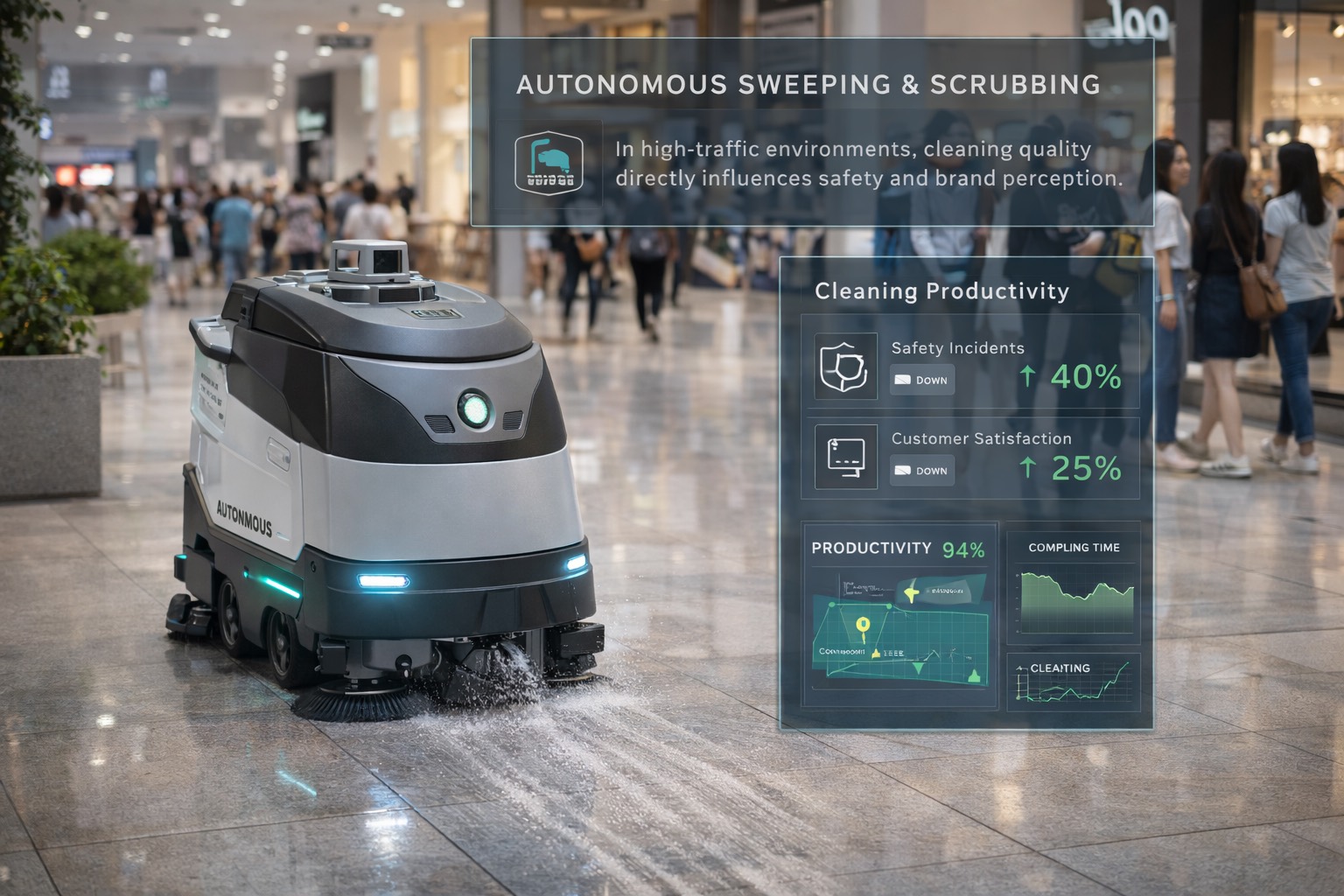 This is where autonomous sweeping and scrubbing starts to make practical sense. The goal is not to “replace” cleaning staff. The goal is to keep standards consistent in wide areas, at predictable intervals, and during inconvenient hours, without relying on overtime as a permanent strategy.